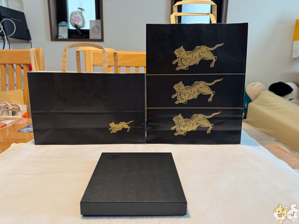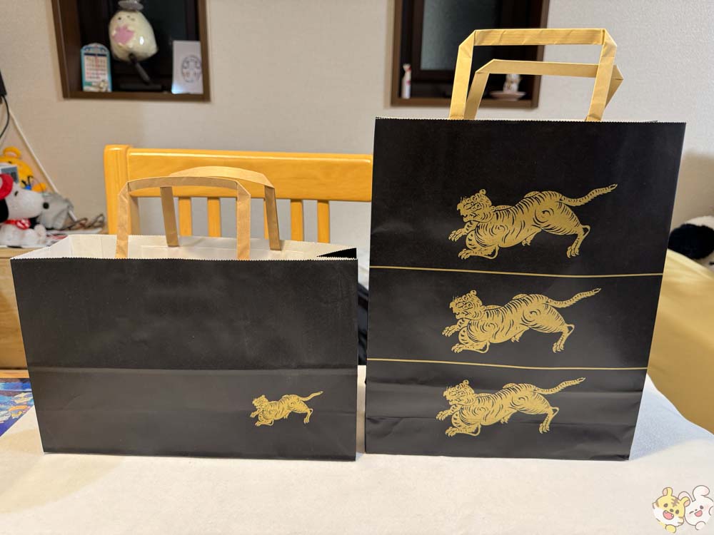 虎屋(とらや)といえば、黒地に疾走する金色の虎が描かれたショッピングバッグ(手提げ袋)のイメージがあります。この手提げ袋でいただくと嬉しいものです。