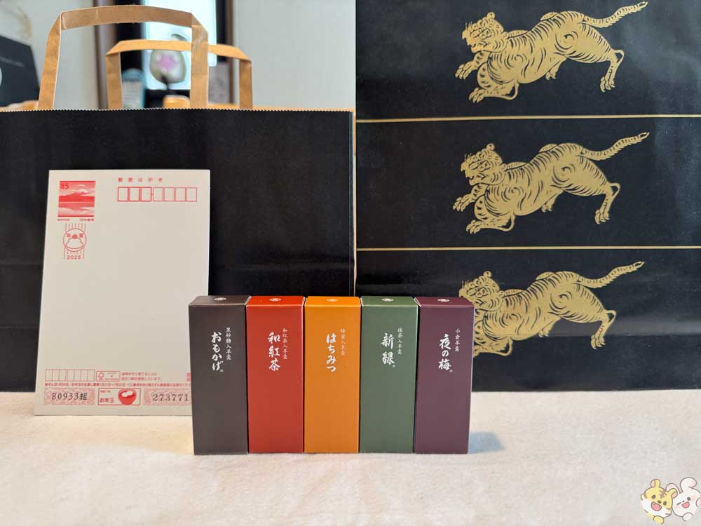 左から、【おもかげ】【和紅茶】【はちみつ】【新緑】【夜の梅】です。